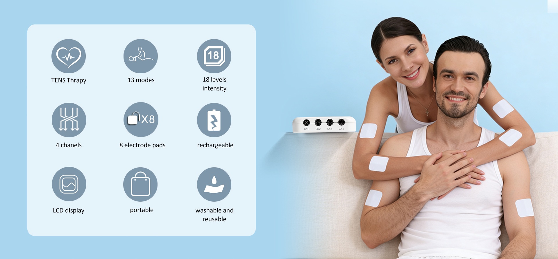 Targets all muscle groups across the body for universal relief of soreness, stiffness and fatigue, one TENS device for total body care.